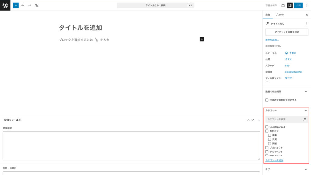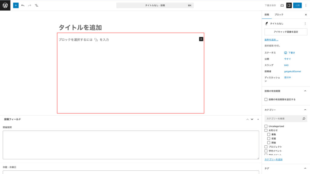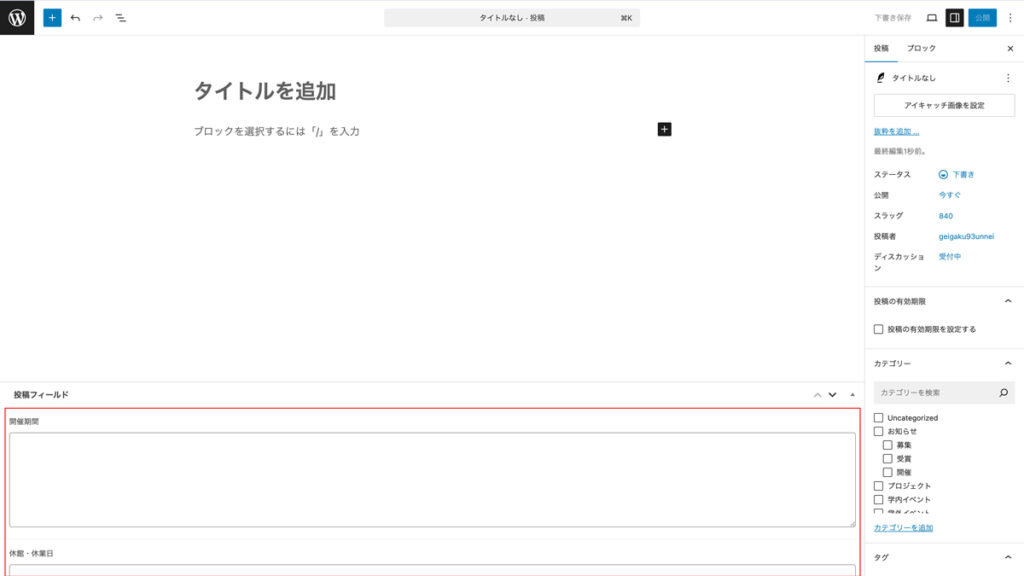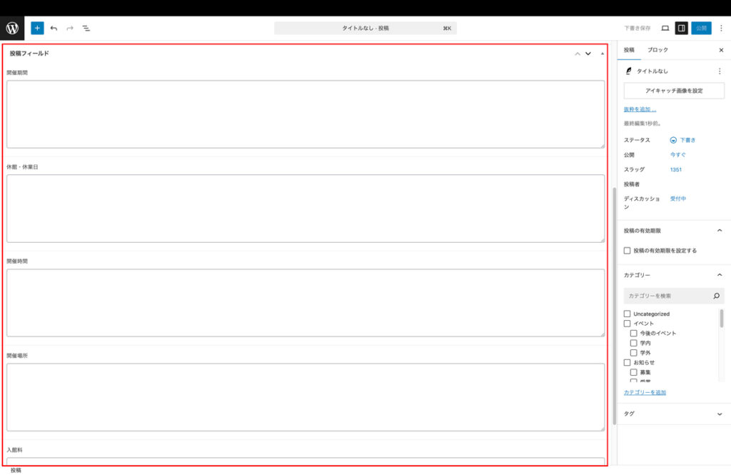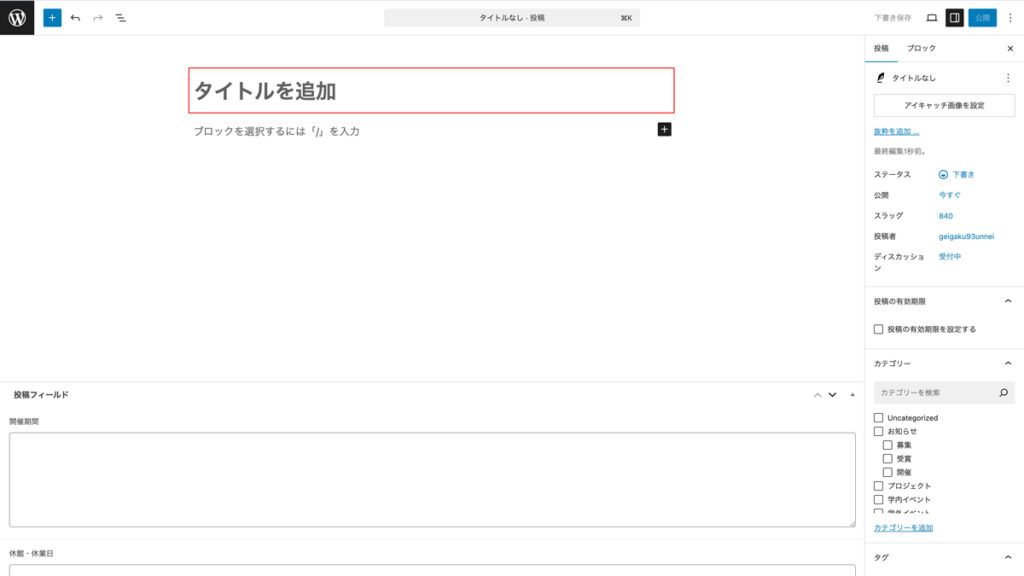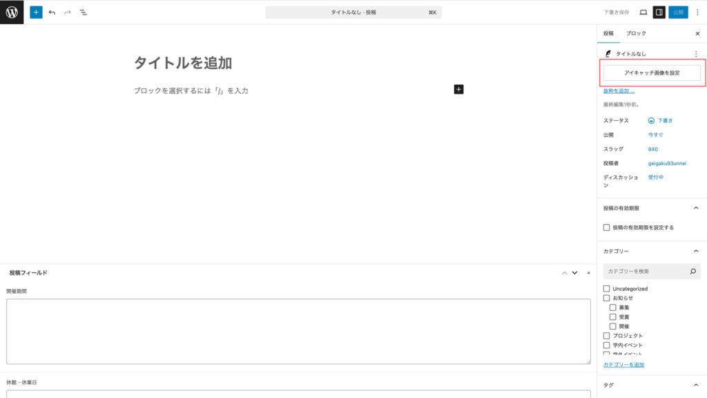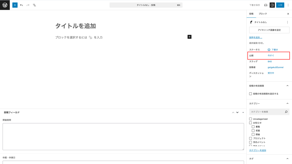 • 開催1ヶ月以上前に投稿を作成する場合は、ページ下部の追加の設定を参考に公開日時を変更してください。