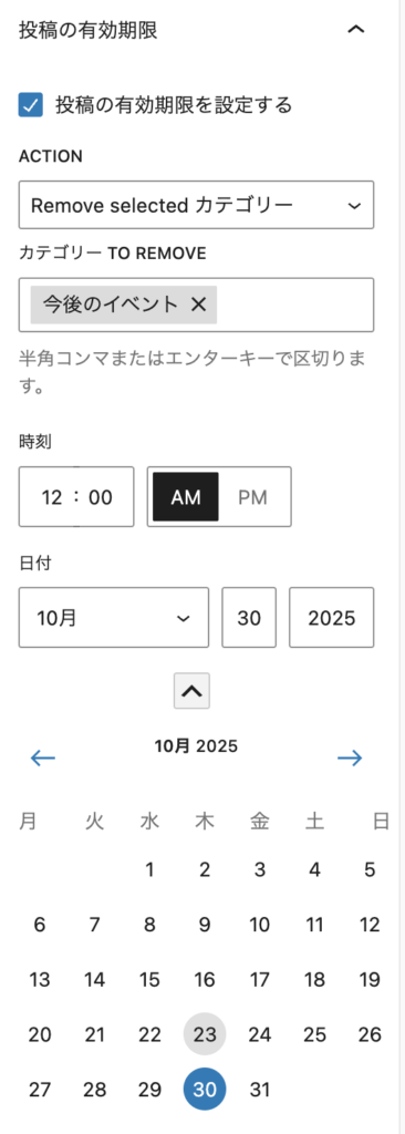 • カテゴリーで「今後のイベント」を指定しているものを、指定日時に外す設定をします。
