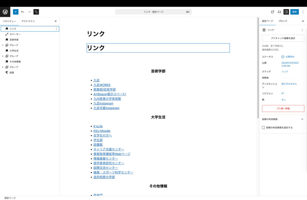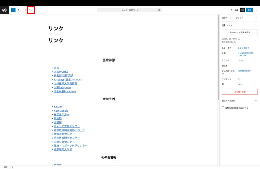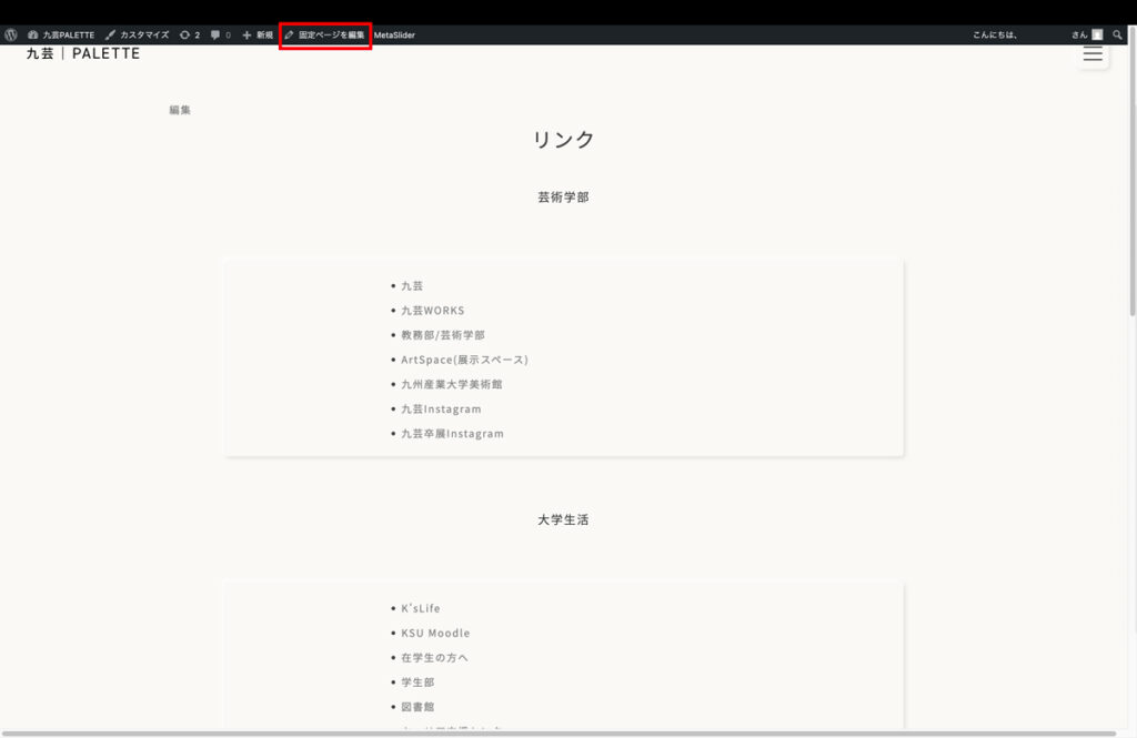 1. リンクの固定ページを開き、固定ページを編集をクリックする