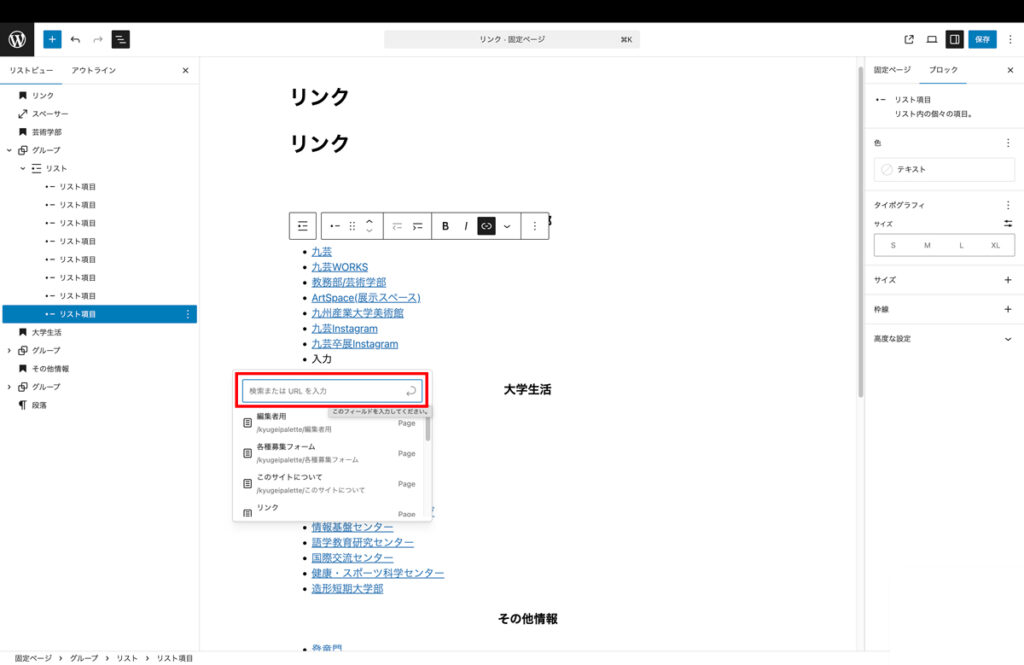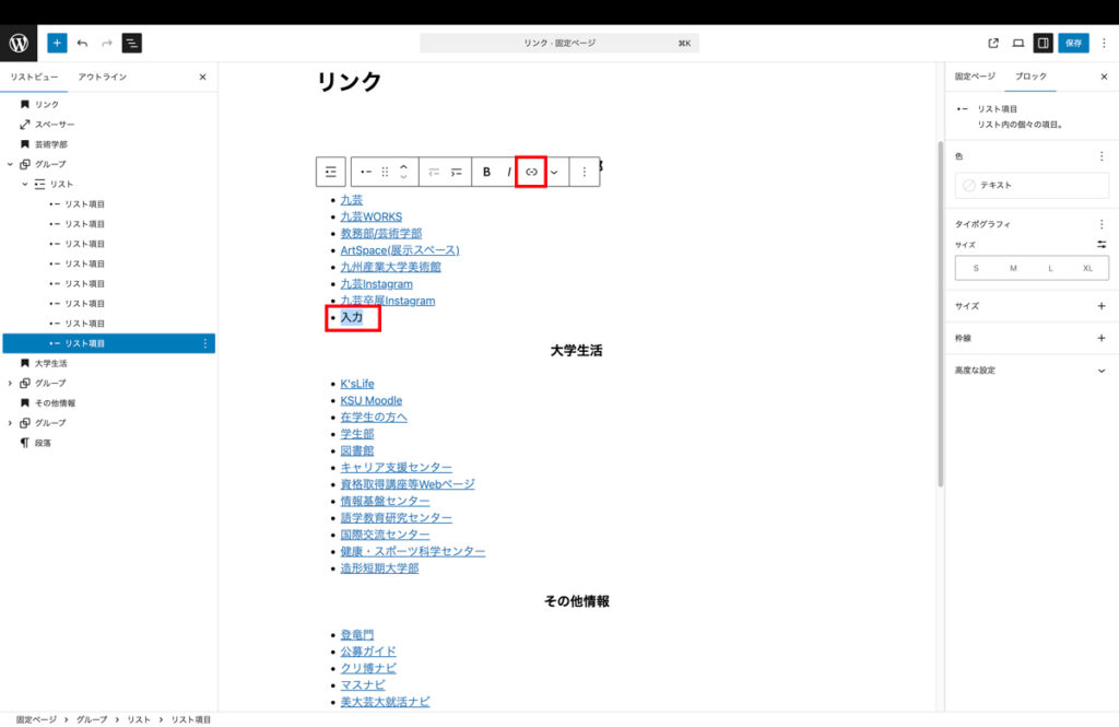 - リンク先の場所を入力したら入力した文をドラッグで選択し、リンクマークをクリックしてください。